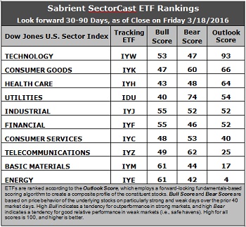 Outlook score is forward-looking while Bull and Bear are backward-looking. As a group, these three scores can be helpful for positioning a portfolio for a given set of anticipated market conditions. Of course, each ETF holds a unique portfolio of stocks and position weights, so the sectors represented will score differently depending upon which set of ETFs is used. We use the iShares that represent the ten major U.S. business sectors: Financial (IYF), Technology (IYW), Industrial (IYJ), Healthcare (IYH), Consumer Goods (IYK), Consumer Services (IYC), Energy (IYE), Basic Materials (IYM), Telecommunications (IYZ), and Utilities (IDU). Whereas the Select Sector SPDRs only contain stocks from the S&P 500, I prefer the iShares for their larger universe and broader diversity. Fidelity also offers a group of sector ETFs with an even larger number of constituents in each.