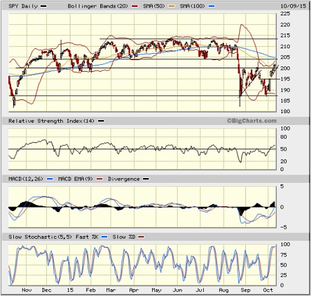The SPDR S&P 500 Trust (SPY) closed Friday at 201.33, which is back above its 50-day simple moving average but still below its 200-day, and the dreaded death cross remains intact (the 50-day SMA crossed down through 200-day in early September). But after some needed backing-and-filling and testing of support around 187, the prior Friday’s trading gave us a bullish engulfing candlestick, and then this past Friday provided a confirmation of the breakout back above resistance at the $200 price level and the 50-day SMA. As I said last week, the 200 price level (corresponding to 2,000 on the S&P 500) had been tested for resistance three times, and it was likely we would soon see another retest. Now that bulls have broken through to the upside, the 204 level (former support line for the long sideways consolidation from February through late-August) is the next level of tough resistance. However, oscillators RSI, MACD, and Slow Stochastic are getting a bit extended, although they could still go further to the upside. If SPY fails in this upward move and falls back below the $200 price level and its 50-day SMA, we might see another retest of support at 187, and perhaps even the August intraday low near 182 (which is also the low of last October). But in any case, as I said last week, the chart is shaping up a lot like 1998 and 2011, and I suspect the bulls will find a way to take stocks higher by year end -- possibly to new highs.