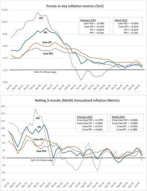 This contributed to an inflation surge in Oct-Jan with CPI and PPI hitting 3.00% and 3.65% YoY in January. But inflation has been falling for the past two months, with all March readings back below 3%. CPI and PPI came in at 2.41% and 2.75% YoY, and the rolling 3-month annualized rates (which I like to follow for a better view of the current trend) were just 2.56% and 1.08%, as shown in the chart below.