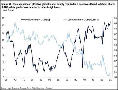 And as Federal Reserve economist Ricardo Marto found in a study, there has been a massive redistribution of wealth upward, from working people to big business and their shareholders (via dividends and buybacks) rather than using profits for capital investment to expand capacity and hiring. Indeed, since the dawn of the new millennium, US corporations have benefited from increasing globalization (in both trade and capital), which created rising profitability and secular disinflation. The chart below from Goldman Sachs Research (4/8/25) illustrates how the combination of technological innovation, globalization, and rising global trade served to lower labor costs and push profit margins to record-high levels. But now those trends are facing obstacles.