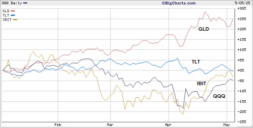 Indeed, gold stocks have been among the best performers YTD, with the NYSE Arca Gold Miners Index up as much as 50%, and gold mining ETFs continue to score at the top of Sabrient’s SectorCast rankings, as I discuss later. In fact, Newmont Mining (NEM) was the top performing stock in the S&P 500 until the latest broad market rally. However, bitcoin, including iShares Bitcoin Trust (IBIT), seems to be behaving less as a store of value and more correlated with Tech stocks and other risk-on assets, as illustrated in the chart below.