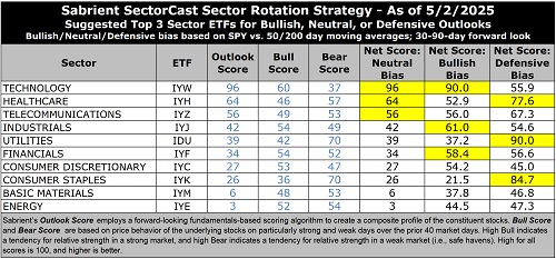 The early April selloff brought down some of the loftiest valuations among the popular mega-cap stocks, with the forward P/E on the S&P 500 falling to 18.5x on 4/8 versus 22.7x at its February peak and today’s 20.6x (as of 5/5). In fact, many of the prominent names in the Technology and Communication Services sectors saw their valuations retreat such that they are scoring well in Sabrient’s growth models (as shown in our next-gen Sabrient Scorecards subscription product)—including large caps like Taiwan Semiconductor (TSM), Broadcom (AVGO), and Spotify (SPOT) that are in the new Q2 2025 Sabrient Baker’s Dozen portfolio, and small caps like Freshworks (FRSH), QuinStreet (QNST), and RingCentral (RNG) that are in our new Sabrient Small Cap Growth 46 portfolio. These portfolios along with Sabrient Dividend 51 (a growth & income strategy yielding 4.05% as of 5/5) are packaged and distributed quarterly to the financial advisor community as unit investment trusts through First Trust Portfolios.