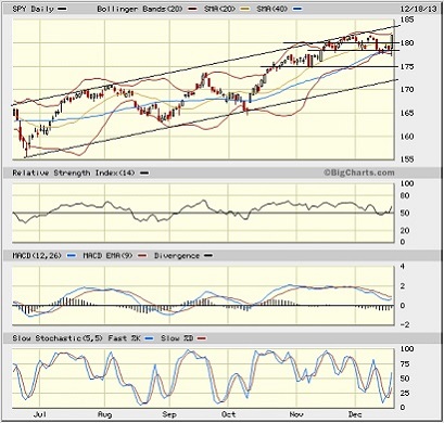 The SPY chart: The SPDR S&P 500 Trust (SPY) closed Wednesday at 181.70, which is another new closing high. It had been clinging to recent support around 178, and actually touched the 50-day simple moving average intraday before rocketing higher. Oscillators like RSI, MACD and Slow Stochastic all have turned back up from their consolidations. The Russell 2000 small caps have been even stronger the past several days. All systems are go for the year-end rally. Even if the SPY remains within its long-standing bullish rising channel, there’s room to run.