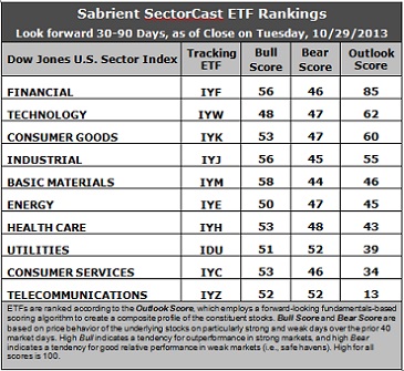 Latest rankings: The table ranks each of the ten U.S. business sector iShares ETFs by Sabrient's proprietary Outlook Score, which employs a forward-looking, fundamentals-based, quantitative algorithm to create a bottom-up composite profile of the constituent stocks within the ETF. The multi-factor model considers forward valuation, historical earnings trends, earnings growth prospects, the dynamics of Wall Street analysts' consensus estimates, accounting practices and earnings quality, and various return ratios. In addition, the table also shows Sabrient's proprietary Bull Score and Bear Score for each ETF.