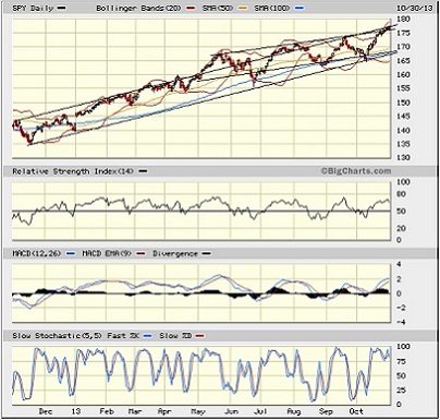 The SPY chart: The SPDR S&P 500 Trust (SPY) closed Wednesday at 176.29, after hitting yet another all-time high at the open. It remains well above all its major simple moving averages as bulls have been reluctant to allow the necessary technical consolidation. Last week, I drew on the chart two bullish channels, and both remain in play -- one started back in November of last year, and the other began in May of this year. Price is continuing to struggle with resistance from the upper line of both channels, while oscillators like RSI, MACD, and Slow Stochastic are now even more overbought than they were last week.
