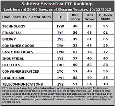 Latest rankings: The table ranks each of the ten U.S. business sector iShares ETFs by Sabrient's proprietary Outlook Score, which employs a forward-looking, fundamentals-based, quantitative algorithm to create a bottom-up composite profile of the constituent stocks within the ETF. The multi-factor model considers forward valuation, historical earnings trends, earnings growth prospects, the dynamics of Wall Street analysts' consensus estimates, accounting practices and earnings quality, and various return ratios. In addition, the table also shows Sabrient's proprietary Bull Score and Bear Score for each ETF.