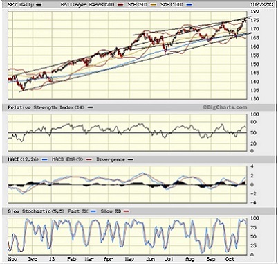 The SPY chart: The SPDR S&P 500 Trust (SPY) closed Wednesday at 174.57, which is just shy of the all-time high achieved on Tuesday. It is now well above all its major simple moving averages. I have drawn on the chart two bullish channels. One started back in November of last year, and the other began in May of this year. Price is running into resistance from the upper line of both channels, while oscillators like RSI, MACD, and Slow Stochastic are now all overbought. Moreover, the Bollinger Bands are stretched wide. All of this points to the need for some technical consolidation before the next up leg can start. In any case, the 170 price level and the 50-day simple moving average should both serve as rock-solid support.