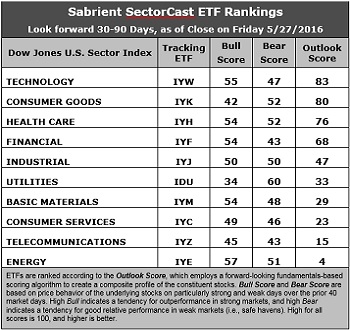 Outlook score is forward-looking while Bull and Bear are backward-looking. As a group, these three scores can be helpful for positioning a portfolio for a given set of anticipated market conditions. Of course, each ETF holds a unique portfolio of stocks and position weights, so the sectors represented will score differently depending upon which set of ETFs is used. We use the iShares that represent the ten major U.S. business sectors: Financial (IYF), Technology (IYW), Industrial (IYJ), Healthcare (IYH), Consumer Goods (IYK), Consumer Services (IYC), Energy (IYE), Basic Materials (IYM), Telecommunications (IYZ), and Utilities (IDU). Whereas the Select Sector SPDRs only contain stocks from the S&P 500, I prefer the iShares for their larger universe and broader diversity. Fidelity also offers a group of sector ETFs with an even larger number of constituents in each.