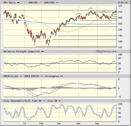The SPY closed Tuesday (and the month of May) at 209.84 and is back above all its major moving averages. It is testing resistance at 210 (corresponding with S&P 500 index at 2100), and could soon challenge its all-time high from last May 2015 at 213.34. After a strong rally from the mid-February edge-of-the-cliff reversal, SPY topped out in mid-April right around this same 210 level and then fell into a sideways channel, even forming a minor head-and-shoulders top with a downside target of 197 (if the pattern confirmed). However, the neckline of the head-and-shoulders formation (around 203.5) held strong, and the bearish pattern never confirmed, instead serving as a launching pad for further upside. Notably, current price action has a lot of similarities to what we saw around the first of December, which has led many chartists to shy away from being too bullish. I have shown several lines of support and resistance that could come into play in this highly congested chart, including a number of gaps during the last couple of weeks that will act as a magnet. I still believe that we are most likely in store for more sideways action during the summer, whether it tops out right here or perhaps a little higher, without setting a new all-time high. However, I also believe we will see a new all-time high before year-end. Oscillators RSI and Slow Stochastic are looking toppy and ready to roll over, although MACD looks more neutral.