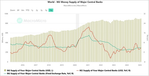So, you just can’t flood the markets with liquidity or “helicopter money” like we did during the lockdowns. The Fed has already reduced its COVID-era balance sheet by 25%, from $9 trillion in April 2022 to $6.7 trillion today, but now Fed chairman Jerome Powell plans to slow the pace of balance sheet reduction, which is essentially a move in the direction of quantitative easing (QE)—a quiet way to provide demand for bonds and reduce interest rates while injecting liquidity into the financial system. The two charts below illustrate the rise in global liquidity and global M2 money supply.