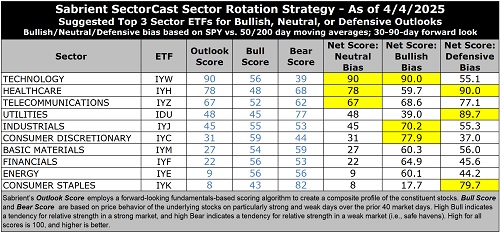 Our rules-based Sector Rotation model, which appropriately weights Outlook, Bull, and Bear scores in accordance with the overall market’s prevailing trend (bullish, neutral, or defensive), fell to a defensive bias on 3/10 when the SPY closed solidly below its 200-day moving average while also being below its 50-day. (Note: In this model, we consider the bias to be bullish from a rules-based trend-following standpoint when SPY is above both its 50-day and 200-day simple moving averages, but neutral if it is between those SMAs while searching for direction, and defensive if below both SMAs.)