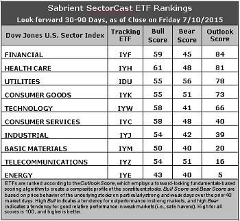 Outlook score is forward-looking while Bull and Bear are backward-looking. As a group, these three scores can be helpful for positioning a portfolio for a given set of anticipated market conditions. Of course, each ETF holds a unique portfolio of stocks and position weights, so the sectors represented will score differently depending upon which set of ETFs is used. We use the iShares that represent the ten major U.S. business sectors: Financial (IYF), Technology (IYW), Industrial (IYJ), Healthcare (IYH), Consumer Goods (IYK), Consumer Services (IYC), Energy (IYE), Basic Materials (IYM), Telecommunications (IYZ), and Utilities (IDU). Whereas the Select Sector SPDRs only contain stocks from the S&P 500, I prefer the iShares for their larger universe and broader diversity. Fidelity also offers a group of sector ETFs with an even larger number of constituents in each.