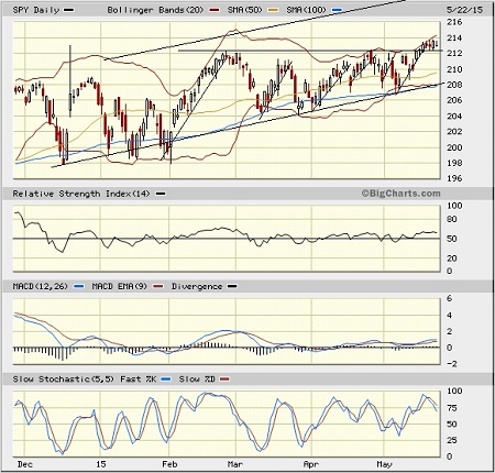 The SPDR S&P 500 Trust (SPY) closed Friday at 212.99 after breaking out through tough resistance to achieve new highs last week. Price seems to waiting for its moving averages to catch up and will likely test resistance-turned-support just above 212. The long-standing uptrend line has been providing reliable support, giving the bulls confidence, and it has crossed above 208 on its way to 209. SPY took six separate runs at that line of resistance at 212 before finally breaking out. However, oscillators RSI, MACD, and Slow Stochastic have all either flattened out or are pointing down bearishly. The pinched Bollinger Bands are spreading out nicely on this move. If SPY pulls back to test support around 212, next support levels include the 50-day simple moving average (approaching 210), the uptrend line and 100-day SMA (above 208), and the critical 200-day SMA (near 204), followed by round-number support at the 200 price level.