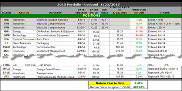 Every other week, the portfolio is reviewed and the oldest positions are reevaluated for either renewal or replacement. Each stock is intended to be held for 52 weeks, but changes or substitutions may occur to any position.