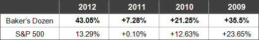 Over the past four years-- in up markets, sideways markets, and turbulent markets -- the Baker's Dozen has outperformed the S&P 500 Index by an annualized average of +12.9% . . . and in 2012, the Baker's Dozen gained 43.05%.