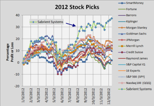 See that green line with the little blue boxes at the top of the chart? That represents the 2012 Sabrient Baker’s Dozen stock picks.