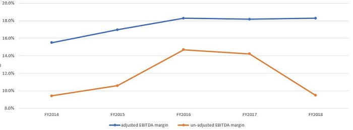 As pictured below, the firm’s adjusted EBITDA margin in 2017 and 2018 remained stable YOY while un-adjusted EBITDA margin declined on a YOY basis in 2017 and 2018. So, while the unadjusted EBITDA margin reveals a company that was under considerable stress, the firm’s adjusted EBITDA margin showcases a company with stable margins – all thanks to the acquisitions.