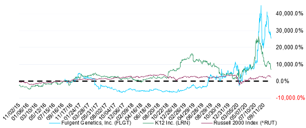 In the two examples above, I highlighted two different firms that have highly speculative near-term growth rates and recently enjoyed unexpected tailwinds in demand from the pandemic. FLGT pivoted to making low margin COVID tests, while LRN experienced a step up in demand as schools began reopening in the fall. Interestingly, analysts expect that LRN’s sales growth will moderate beginning next year in Q1 FY2022, while the growth expected for FLGT is expected to persist into Q2 CY2021. Chart 3 below illustrates, in a 5-year comparison of share prices, the striking recent outperformance of both FLGT and LRN versus the Russell 2000 small cap index. However, despite investor optimism, these valuations appear highly speculative and supported by sales growth that may not persist and could prove to be out of reach beyond the near-term.