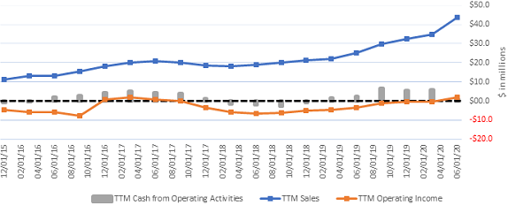 While it is commendable that FLGT was able to adapt to the rapidly changing landscape, sales from COVID tests involve a much lower margin than its legacy next generation sequencing (NGS) products. In Q2 2020, the average selling price per billable test was just $96 and the cost per billable test was $43, yielding a 55.3% gross margin. In contrast, last year the average selling price ($515), cost per test ($221), and gross margin (57.0%) were all significantly higher. Moving down the income statement, FLGT’s operating income has historically fluctuated near or below $0, as shown in Chart 1 below.