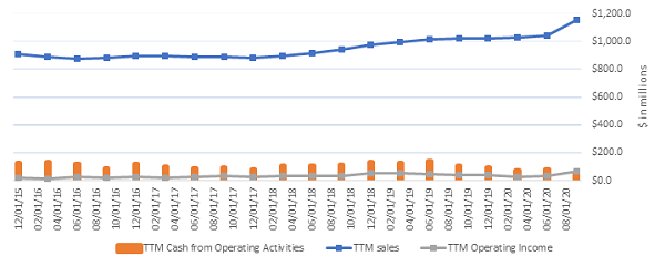 Interestingly, analysts only expect that this level of growth will persist for the next three quarters. Once the COVID-driven surge of demand subsides, analysts predict that sales will contract slightly in Q1 FY2022. This is a sign that there could be issues with sustainable growth. A step up in demand that is new to the business and one-time in nature seems to be temporarily masking underlying weakness as pro forma sales contracted slightly YOY in the two prior consecutive quarters, Q4 and Q3 FY2020. The fact that analysts expect that sales growth will return to a low single digit decline beginning next year, in Q1 FY2022, further supports this view.