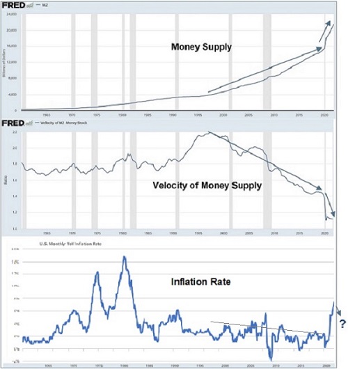 Economists generally believe that inflation is primarily driven by money supply. But a rising money supply alone does not necessarily lead to inflation. As shown in the chart, money supply has risen rapidly since the late 1990’s while velocity of money supply has fallen – such that CPI inflation remained low, and in fact the trend was down (albeit volatile).