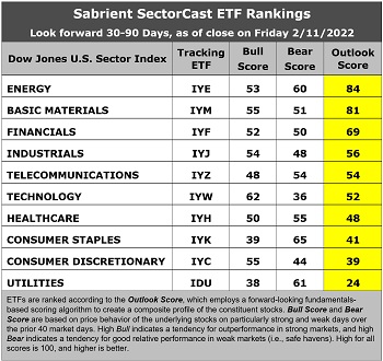 Outlook score is forward-looking while Bull and Bear are backward-looking. As a group, these three scores can be helpful for positioning a portfolio for a given set of anticipated market conditions. Of course, each ETF holds a unique portfolio of stocks and position weights, so the sectors represented will score differently depending upon which set of ETFs is used. We use the iShares that represent the ten major U.S. business sectors: Financials (IYF), Technology (IYW), Industrials (IYJ), Healthcare (IYH), Consumer Staples (IYK), Consumer Discretionary (IYC), Energy (IYE), Basic Materials (IYM), Telecommunications (IYZ), and Utilities (IDU). Whereas the Select Sector SPDRs only contain stocks from the S&P 500 large cap index, I prefer the iShares for their larger universe and broader diversity.