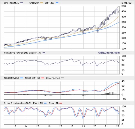 In addition, in my December post, I discussed the 10-year monthly chart of SPY and how ominously stretched it had become from its moving averages. After a bearish “shooting star” pattern for the month of November, and something close to a bearish “hanging man” pattern in December, the setup for January was high probability to finally bring about a correction; it just needed a catalyst, which of course it got from inflation and perhaps Russia. As shown in the chart below, the gap above the 20-day SMA has closed a lot, so perhaps we are close to a bottom. However, price has fallen outside the steep uptrend channel, so it’s hard to say where the bottom might be. Perhaps (or hopefully?), like I suggested from the daily chart above, the 430 level is a downside target on the monthly chart as well.