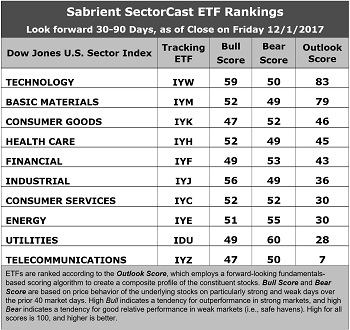 Outlook score is forward-looking while Bull and Bear are backward-looking. As a group, these three scores can be helpful for positioning a portfolio for a given set of anticipated market conditions. Of course, each ETF holds a unique portfolio of stocks and position weights, so the sectors represented will score differently depending upon which set of ETFs is used. We use the iShares that represent the ten major U.S. business sectors: Financial (IYF), Technology (IYW), Industrial (IYJ), Healthcare (IYH), Consumer Goods (IYK), Consumer Services (IYC), Energy (IYE), Basic Materials (IYM), Telecommunications (IYZ), and Utilities (IDU). Whereas the Select Sector SPDRs only contain stocks from the S&P 500, I prefer the iShares for their larger universe and broader diversity.