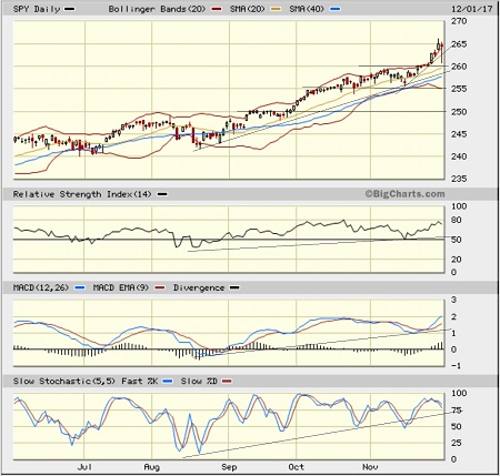The SPDR S&P 500 ETF (SPY) closed Friday, December 1, at 264.46 in a relentless march higher. One convincing breakout above resistance is followed by another. This time, it was the 260 level (corresponding to 2,600 on the S&P 500) last week. Positive divergences abound, including the various oscillators like RSI, MACD, and Slow Stochastic. However, last week’s big move created a bit too much divergence from the 20-day simple moving average (i.e., the proverbial “rubber band” is stretched), and although the intraday selloff on Friday allowed price to test support at the 20-day, it was quickly bought and is back to a stretched position. In addition, Bollinger Bands have widened considerably, while the oscillators are all near overbought territory and look poised to cycle back down. Thus, I expect some price consolidation to ensue so that the stretched and overbought conditions can at least neutralize. This observation would appear to jibe with the current tax situation, as both houses of Congress now must reconcile their respective tax bills before becoming the law of the land, as well as the uncertainty around the looming budget deadline. The 20-day SMA (now approaching 260, coinciding with the breakout resistance level) has been providing strong support since late August. Further support levels come in at the uptrend line (near 258), the 50-day SMA (near 257), and a prior breakout level at 255, followed by the 100-day SMA (around 253), a prior breakout at 250, and the critical 200-day SMA (down near 245). SPY still hasn’t tested its 200-day SMA since the election.