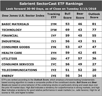 Outlook score is forward-looking while Bull and Bear are backward-looking. As a group, these three scores can be helpful for positioning a portfolio for a given set of anticipated market conditions. Of course, each ETF holds a unique portfolio of stocks and position weights, so the sectors represented will score differently depending upon which set of ETFs is used. We use the iShares that represent the ten major U.S. business sectors: Financial (IYF), Technology (IYW), Industrial (IYJ), Healthcare (IYH), Consumer Goods (IYK), Consumer Services (IYC), Energy (IYE), Basic Materials (IYM), Telecommunications (IYZ), and Utilities (IDU). Whereas the Select Sector SPDRs only contain stocks from the S&P 500 large cap index, I prefer the iShares for their larger universe and broader diversity.