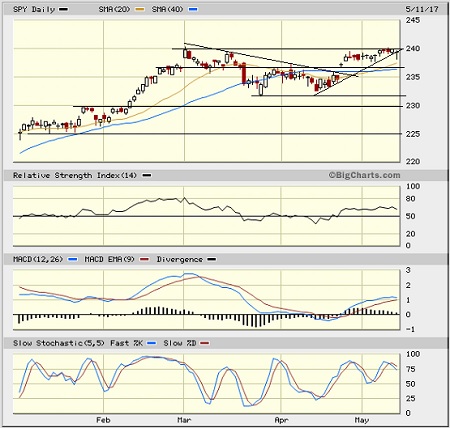 The SPY closed Thursday at 239.38 and has been bumping its head on the tough psychological resistance level of 240 (corresponding to about 2,400 on the S&P 500 index). It got the upside breakout that I predicted in my prior article on April 22, from a bullish ascending wedge (near 236) and neutral symmetrical triangle (apex at 235), and now it is forming a new bullish ascending wedge with 240 as the breakout level (with the same uptrend line as the previous ascending wedge. The 20-day simple moving average provided support intraday on Thursday and has crossed up through the 50-day. If SPY fails to break out and instead breaks down below the uptrend line, next support levels include the 236 level, a minor low in March around 232, the 100-day SMA now around 233, prior resistance-turned-support levels at 230 and 225, and the critical 200-day SMA (also at 225). As for oscillators like RSI, MACD, and Slow Stochastic, all three are looking like they are turning over and may need to cycle back down before price can take another run at a breakout. Overall, the technical picture looks pretty good for the medium term, although the near-term likely will bring more consolidation.