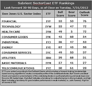1. Financial (IYF) retains the top spot with an Outlook score of 76. Stocks within IYF are getting good analyst support and insider buying, and they have relatively low forward P/Es. Technology (IYW) is in the second spot with a 72. Stocks within IYW are displaying relatively low forward P/Es, as well, along with strong return ratios.