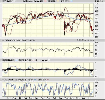 The SPDR S&P 500 Trust (SPY) closed on Friday at 190.52 after retesting and bouncing from the August lows. As I have observed before, the full year chart looks virtually identical to 2011. However, the start to the subsequent year hasn’t worked out quite same this year as it did in 2012. SPY remains below all of its key moving averages, including the 20-day, 50-day, 100-day, and 200-day simple moving averages (note that the 100 and 200 have converged together and now sit at about 201). Previous support levels have failed, and technical formations that seemed to have been forming have all fallen apart, and now a triple bottom is being tested at a critical support level around 182.5 dating back to October 2014 and August 2015. Oscillators RSI, MACD, and Slow Stochastic are all bouncing from deeply oversold levels, albeit on falling volume. Price should continue higher, perhaps to test support turned resistance at 195. If investors can shake off their inordinate fear and turn this back into a quality-driven rather than headline-driven market, bulls might have a chance at taking stock higher from here. Otherwise, there is a risk of further downside.