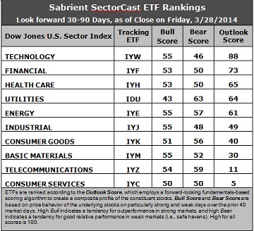 Relative sector rankings are based on our proprietary SectorCast model, which builds a composite profile of each equity ETF based on bottom-up aggregate scoring of the constituent stocks. The “Outlook Score” employs a forward-looking, fundamentals-based multifactor algorithm considering forward valuation, historical and projected earnings growth, the dynamics of Wall Street analysts’ consensus earnings estimates and recent revisions (up or down), quality and sustainability of reported earnings (forensic accounting score), and various return ratios. It helps us predict relative performance over the next 1-3 months.