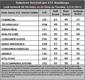 1. Financial (IYF) stays at the top of the Outlook rankings with a 77, and Technology (IYW) continues in second place with a 73. Industrial (IYJ) and Healthcare (IYH) round out the top four. IYF still has one of the lowest (best) forward P/Es, and it continues to gain support among analysts as the banks re-emerge, despite their vulnerability to Europe’s turmoil. IYW remains strong in its return ratios as margins are high for tech products.