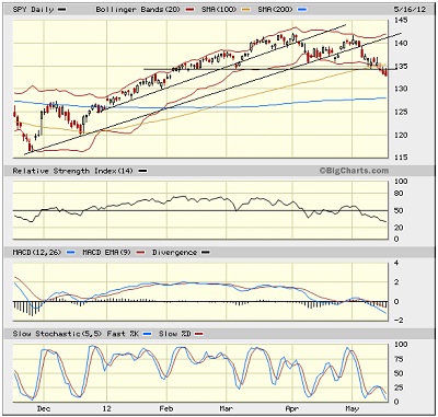 SPY closed Wednesday at 132.83. Last week, it lost the strong support it had been enjoying at the convergence of its 50-day simple moving average and the uptrend line. This week it has lost support at the convergence of its 100-day simple moving average and the line of prior support just below 135. Volume is still elevated during this period of weakness. RSI, MACD, and Slow Stochastic are now deeply oversold. There is little in the way of support between here and the 200-day SMA near 128, so an immediate bounce is needed. Given the weak technical conditions, any sign of promising news from across the pond could result in a very strong relief rally.