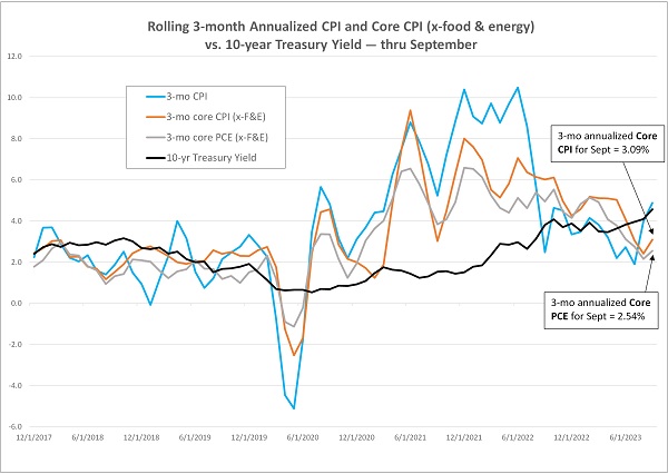 As for inflation, because the Fed can do little about energy and food prices, which have relatively inelastic demand, it is best to focus on core inflation (excluding food & energy). In September, core CPI (excluding food and energy) was up 4.1% year-over-year (YoY), which was an improvement from August’s 4.3% print. While the focus tends to be on headline YoY numbers, I prefer to focus on current price trends using the month-over-month (MoM) readings rather than comparing to the price index 12 months ago. And because inflation can be volatile, computing a rolling 3-month annualized average smooths it out a bit. So, the chart below compares a variety of rolling 3-month annualized inflation metrics—including CPI, core CPI (ex-food & energy), and the Fed’s preferred core PCE (ex-food & energy)—along with the 10-year Treasury yield, starting in December 2017 through current. As shown, core inflation had been improving dramatically, showing a steep downtrend since the middle of last year. The September uptick looks like normal month-to-month volatility.