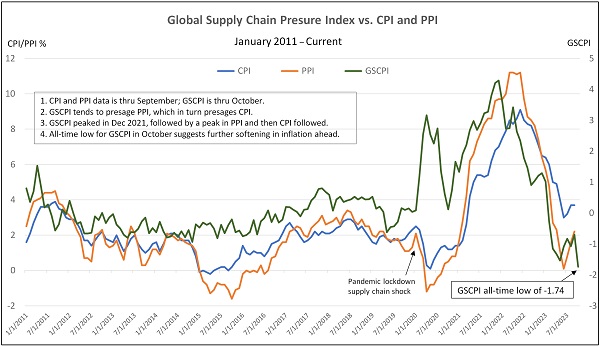 Importantly, today brought the October release of the New York Fed’s Global Supply Chain Pressure Index (GSCPI), which measures the number of standard deviations from the historical average value (aka Z-score) and generally presages movements in PPI ,and by extension, CPI. It plummeted from a December 2021 all-time high of +4.31 down to today’s October 2023 reading of -1.74—its lowest level ever, even lower than during the Financial Crisis. As shown in the chart below, GSCPI tends to presage PPI, which in turn tends to presage CPI. So, this bodes well for October CPI/PPI readings next week and PCE at month end, with a likely resumption in their downtrends.
