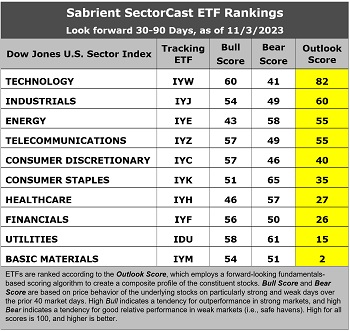 As a group, these three scores can be helpful for positioning a portfolio for a given set of anticipated market conditions. Of course, each ETF holds a unique portfolio of stocks and position weights, so the sectors represented will score differently depending upon which set of ETFs is used. We use the iShares that represent the ten major U.S. business sectors: Financials (IYF), Technology (IYW), Industrials (IYJ), Healthcare (IYH), Consumer Staples (IYK), Consumer Discretionary (IYC), Energy (IYE), Basic Materials (IYM), Telecommunications (IYZ), and Utilities (IDU). Whereas the Select Sector SPDRs only contain stocks from the S&P 500 large cap index, I prefer the iShares for their larger universe and broader diversity.