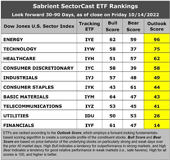 Relative sector rankings are based on our proprietary SectorCast model, which builds a composite profile of each of over 900 equity ETFs based on bottom-up aggregate scoring of the constituent stocks. The Outlook Score employs a forward-looking, fundamentals-based multifactor algorithm considering forward valuation, historical and projected earnings growth, the dynamics of Wall Street analysts’ consensus earnings estimates and recent revisions (up or down), quality and sustainability of reported earnings, and various return ratios. It helps us predict relative performance over the next 2-6 months.