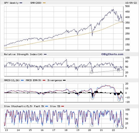 The SPDR S&P 500 Trust (SPY) closed Friday at 357.63 after setting a new 52-week low (actually, the lowest since Q4 2020) just the day prior in a huge capitulation/reversal day. Some are calling last Thursday a market bottom, but that remains to be seen. The main thing I want to point on the weekly chart below is the 200-week simple moving average, which for the past decade has served as solid support (other than a very brief moment during the pandemic selloff when it was violated, but quickly recovered). It served as strong support last week, so we will need to see what happens during this notorious month of October, particularly as Q3 earnings reports and forward guidance are released. I have also pointed out some of the prior extreme lows for RSI, MACD, and Slow Stochastics oscillators, which all led to solid recoveries. Each once again hit extreme lows last week, although you can see the positive divergence in RSI (higher lows) versus the lower low in price, which is bullish.