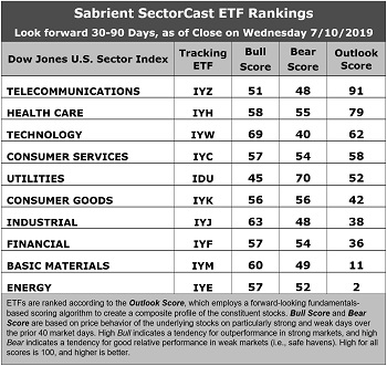 1. Telecom stays in the top spot with a robust Outlook score of 91. (It is worth noting that nearly 50% of the IYZ ETF is made up of just two stocks: CSCO and VZ.) It displays the lowest forward P/E of 14.7x, pretty good sell-side analyst sentiment (net revisions to EPS estimates), and solid return ratios. However, its pure GARP metrics are only average, with projected year-over-year EPS growth rate of 7.4% and a forward PEG ratio (forward P/E divided by projected EPS growth rate) of 2.00, which ranks it tied (with Basic Materials) for 7th out of 10 sectors on PEG, ahead of only fellow defensive sectors Utilities and Consumer Goods (Staples/Noncyclical), which is why we don’t see many Telecoms as candidates for Sabrient’s GARP portfolios (which have a 12-24 month outlook rather than 2-6 months used in SectorCast). Healthcare takes second with an Outlook score of 79, as it displays the best (albeit neutral) sell-side analyst sentiment (given that many sectors continue to show net negative revisions), and solid return ratios. Technology has moved back up to take third with an Outlook score of 62, as it displays reasonable sell-side analyst sentiment, a strong projected EPS growth rate of 13.9%, solid return ratios, and a forward PEG of 1.51. Rounding out the top six are Consumer Services (Discretionary/Cyclical), Utilities, and Consumer Goods (Staples/Noncyclical).