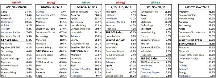 The US economic expansion just became the longest in history, the latest jobs report was outstanding, unemployment remains historically low, business and consumer confidence are strong, institutional accumulation is solid, and the Federal Reserve is a lock to lower interest rates at least once, and more if necessary (the proverbial “Fed Put”). Indeed, the old adages “Don’t fight the Fed!” (as lower rates support both economic growth and higher equity valuations) and “The trend is your friend!” (as the market hits new highs) are stoking optimism and a critical risk-on rotation, leading the S&P 500 this week to touch the magic 3,000 mark and the Dow to eclipse 27,000. If this risk-on rotation continues, it bodes well for Sabrient’s cyclicals-oriented portfolios.
