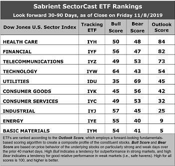 1. There are some subtle shifts in the rankings this month. Healthcare has moved into the top spot with an Outlook score of 84, primarily due to an attractive forward P/E (16.0x) and the best sell-side analyst sentiment (net positive revisions to EPS estimates). IYH also displays solid projected year-over-year EPS growth rate of 10.1%, the lowest (most attractive) forward PEG ratio (forward P/E divided by projected EPS growth rate) of 1.58, good return ratios, and the best insider sentiment (open market insider buying). Taking second once again is Financial with a score of 82, as it similarly displays reasonably good factor scores across the board, including a low P/E (16.3x) and an attractive forward PEG ratio of 1.72. Rounding out the top six are Telecom, Technology, Utilities, and Consumer Goods (Staples/Noncyclical). Notably, Technology displays the highest projected growth rate (13.2x) but also the highest forward P/E (21.7x).