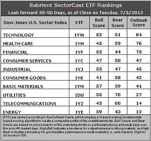 1. Technology (IYW) retains the top spot with an Outlook score of 84 this week, followed once again by Healthcare (IYH) at 76. Financial (IYF) remains a close third at 75. The top three further increased their distance above the rest of the pack, with a 28-point gap down to fourth place Consumer Services (IYC). These rankings are reflective of an overall bullish bias, with the economically sensitive sectors like Technology, Financial, Consumer Services, and Industrial in the top five.