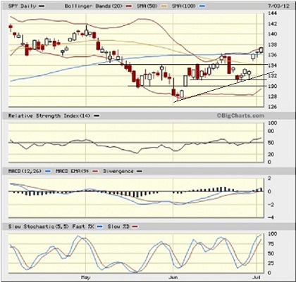 Looking at the SPY chart, it has made quite a bullish move, as I suggested might happen with its developing bullish ascending triangle pattern. SPY closed Tuesday at 137.4 and now it finds itself at its upper Bollinger Band and breaking out of the sideways channel and ascending triangle and above its 100-day simple moving average. RSI, MACD, and Slow Stochastic all look quite bullish.
