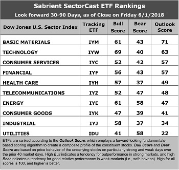 Outlook score is forward-looking while Bull and Bear are backward-looking. As a group, these three scores can be helpful for positioning a portfolio for a given set of anticipated market conditions. Of course, each ETF holds a unique portfolio of stocks and position weights, so the sectors represented will score differently depending upon which set of ETFs is used. We use the iShares that represent the ten major U.S. business sectors: Financial (IYF), Technology (IYW), Industrial (IYJ), Healthcare (IYH), Consumer Goods (IYK), Consumer Services (IYC), Energy (IYE), Basic Materials (IYM), Telecommunications (IYZ), and Utilities (IDU). Whereas the Select Sector SPDRs only contain stocks from the S&P 500 large cap index, I prefer the iShares for their larger universe and broader diversity.