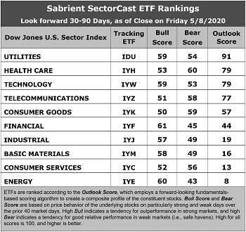 In this periodic update, I provide a market commentary, discuss Sabrient’s new process enhancements, offer my technical analysis of the S&P 500, and review Sabrient’s latest fundamentals-based SectorCast rankings of the ten US business sectors, and serve up some actionable ETF trading ideas. In summary, our sector rankings now look defensive, and our sector rotation model maintains a neutral posture as it climbs from the depths of the selloff. Meanwhile, the technical picture remains bullish as it continues to gather speculative conviction on a better future, although with elevated volatility amid progress/setbacks as the economy tries to gradually reopen in the face of an ongoing coronavirus threat. Read on....
