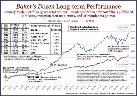 Even during those first 6-1/2 years in which the Baker’s Dozen portfolios consistently outperformed, temporary periods would arise in which investor sentiment became misaligned from the consensus fundamental outlook of the sell-side analyst community. This is normal market behavior, so Sabrient chose to stay true to its disciplined investment process and ride out those fleeting periods of misalignment. However, in retrospect, it seems mid-2015 marked the beginning of a “new normal” of persistent and painful periods of irrational/unwarranted defensive sentiment due to both macro events (like populism, elections, China trade war, Fed monetary policy) and the rise of algorithmic trading (which can amplify and prolong fluctuations in sentiment).