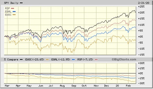 Let’s take a closer look at the past 12 months, which roughly corresponds to the life of the February 2019 Baker’s Dozen portfolio. The portfolio’s default benchmark, the cap-weighted S&P 500, which of course is dominated by a handful of mega-cap Tech secular growth juggernauts, has handily outperformed its equal-weighted brethren, including the S&P 500 Equal-Wt (RSP), the Russell 1000 Equal-Wt (EQAL), and the S&P 600 Small Cap Equal-Wt (EWSC), as shown in the chart below for the 12 months leading up to 2/21/20, just before last week’s big selloff. This made it quite difficult for any cap-diversified and equal-weight portfolio to keep up with the narrow leadership of the S&P 500. Even during last week’s selloff, the Value factor and small-mid caps lagged Growth and Momentum factors and large caps, according to S&P Dow Jones Indices.